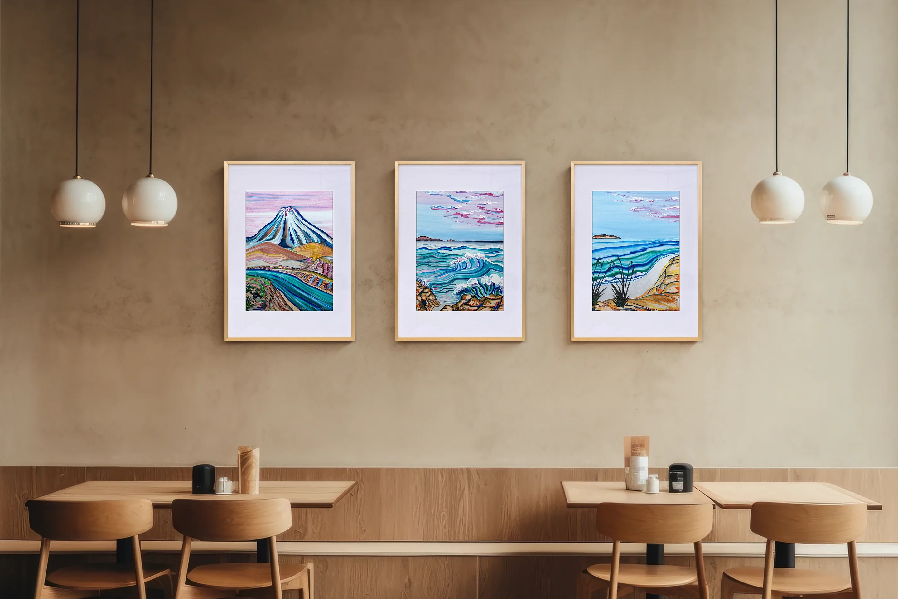 Peaceful color, local life, and the expansive reach of the natural world. Combining the delicate transparency of watercolor with a dash of bold acrylic, this series captures the harmony between the land and the creatures that inhabit it. From sun-drenched beaches to winding mountain rivers, these works are populated by the quiet observers of the wild—the sun-baked gecko, the foraging pukeko, and the lone seagull—reminding us of the vibrant life found in nature's most peaceful corners